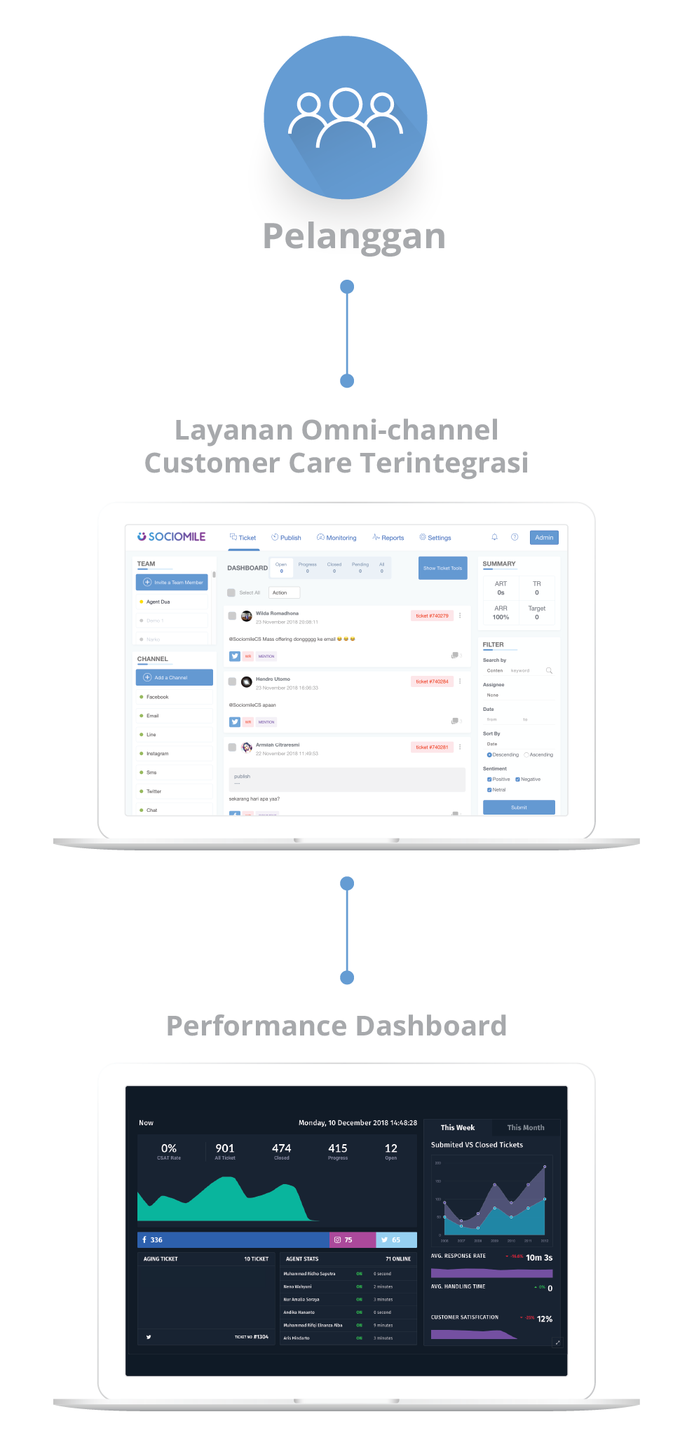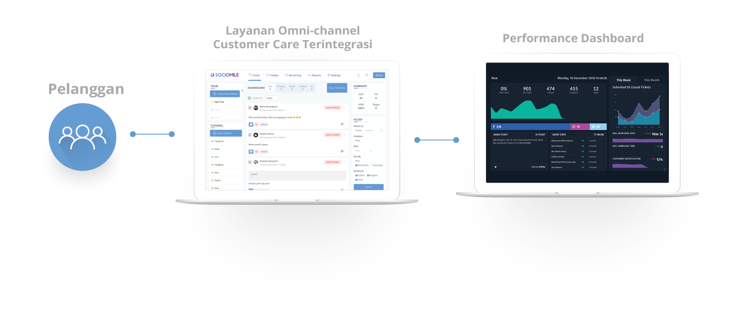 We present with various advanced features in omnichannel (Email, SMS, Facebook, Twitter, Instagram, Line, Play Store, Live Chat, Voice, and Telegram) multi-agent, ticketing system, KPI, and reporting, only in one platform.